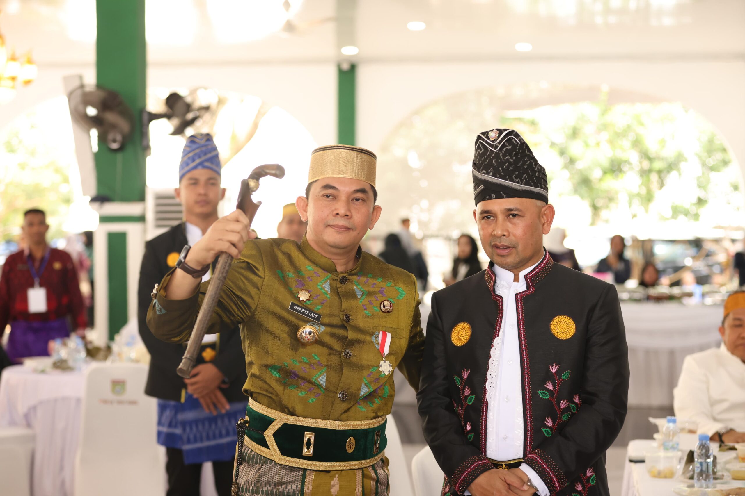 Bupati Tanah Bumbu, Andi Rudi Latif (Bang Arul), bersama Wakil Bupati H. Bahsanudin, Forkopimda, dan tamu undangan, menyaksikan pertunjukan tari kolosal yang dibawakan oleh Sanggar Sidi Batuah dari Perkumpulan Dayak Meratus, binaan Disbudporapar Tanah Bumbu.