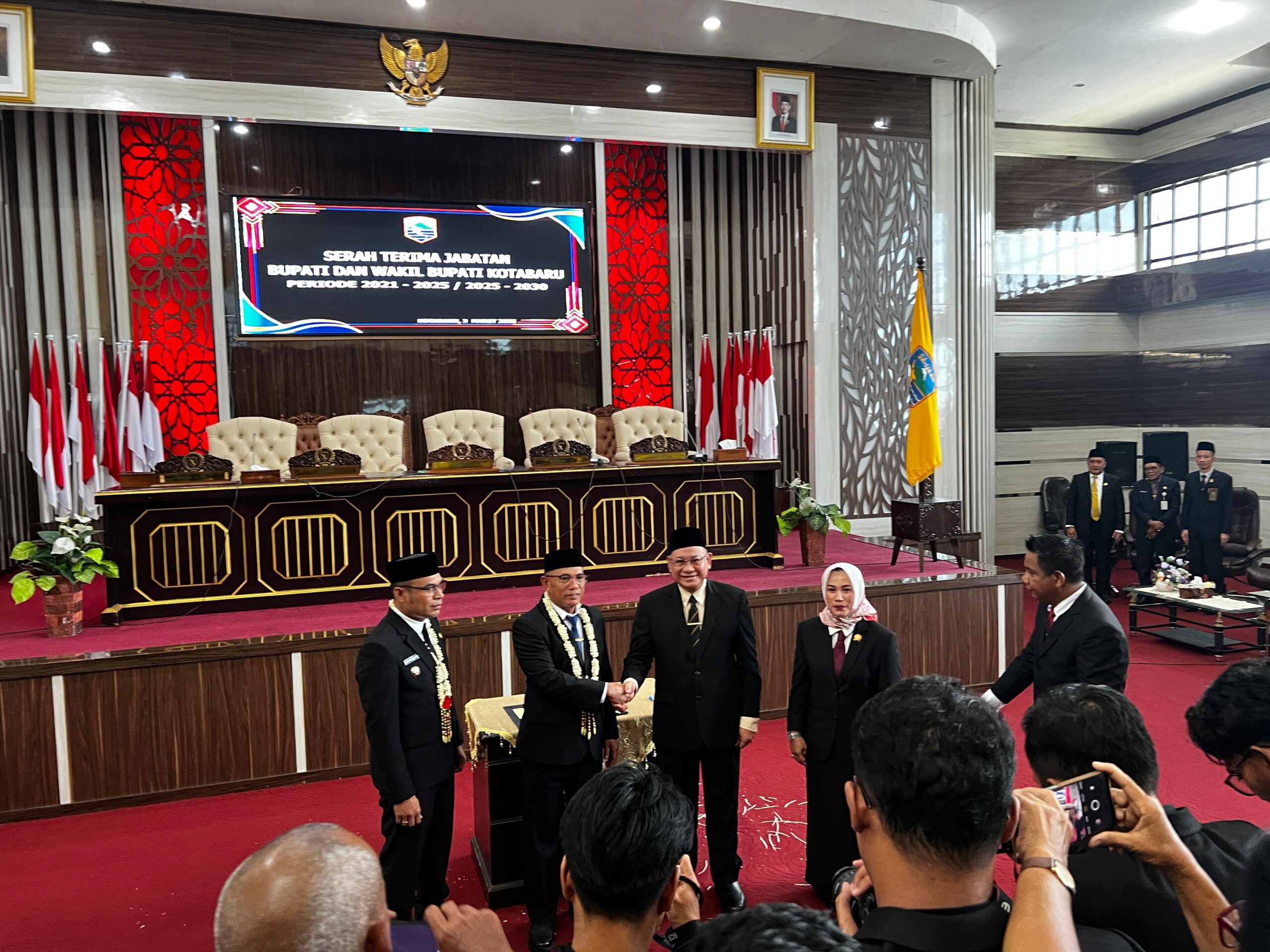 Nusantaravoices, Kotabaru – Serah Terima Jabatan (Sertijab) Bupati dan Wakil Bupati Kotabaru Terpilih periode 2025 – 2030 dilaksanakan di Gedung DPRD Kotabaru Lt.III, Senin(03/03/25). Jabatan yang Sebelumnya dipegang oleh Bupati dan Wakil Bupati Priode 2021-2025, H.Sayed Alaydrus, S.H dan Andi Rudi Latief, S.H, Kini Resmi Beralih kepada Bupati dan wakil Bupati periode 2025-2030, H.Muhammad Rusli, S.sos dan Syairi Mukhlis, S.sos.